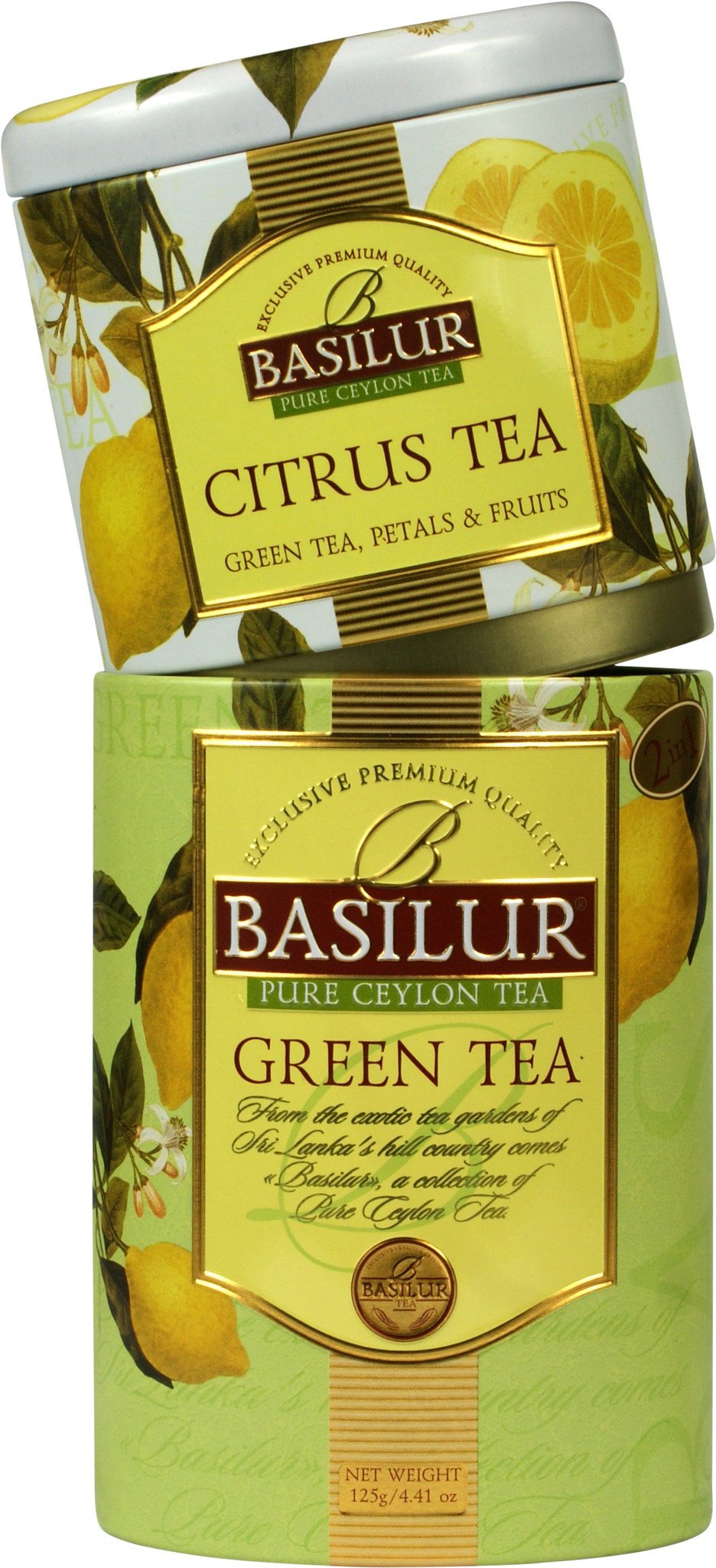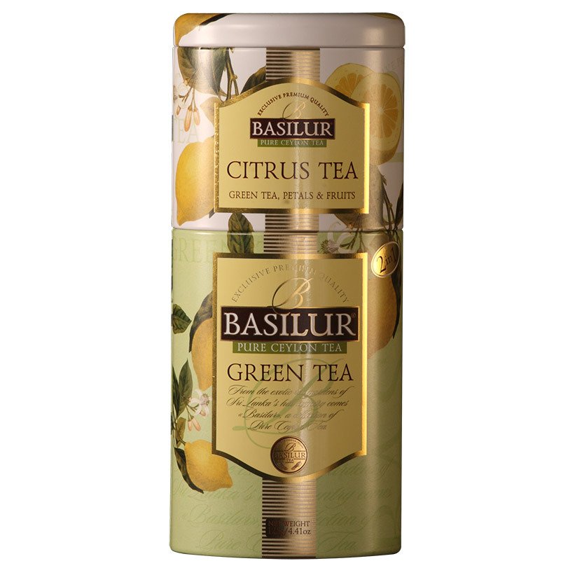 TOP TIN - Basilur Citrus Tea is an ultra-premium tea, perfectly blended with natural papaya, pineapple and rose and marigold petals to give it a robust and elegant flavour. This is a connoisseur's perfect cuppa. BOTTOM TIN - This fine quality green tea is flawlessly crafted to bring out the full flavour along with its exotic fragrance and a smooth elegant taste of pure Ceylon green tea.